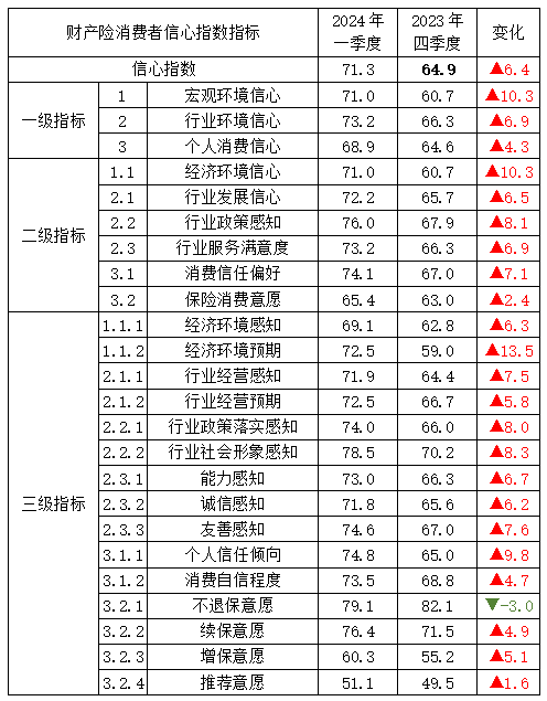 財產險方面,一季度財產險消費者信心指數為71.3,環比上升6.4,同比下降2.8,升至信心較強區間,細分指標呈現以下變動趨勢: